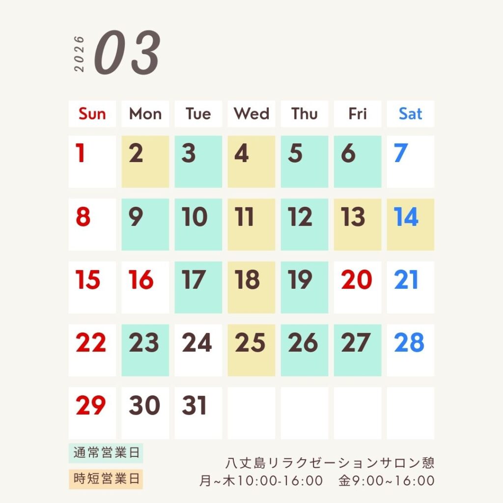 最後に、私事ですが4月から家族の新生活が始まります。4月以降の予約は家族の予定が分かってからの受付となります。定期的にご利用いただいている皆さまには出来る限り同じ周期で受けていただけるよう配慮させていただきます。何卒よろしくお願いいたします。